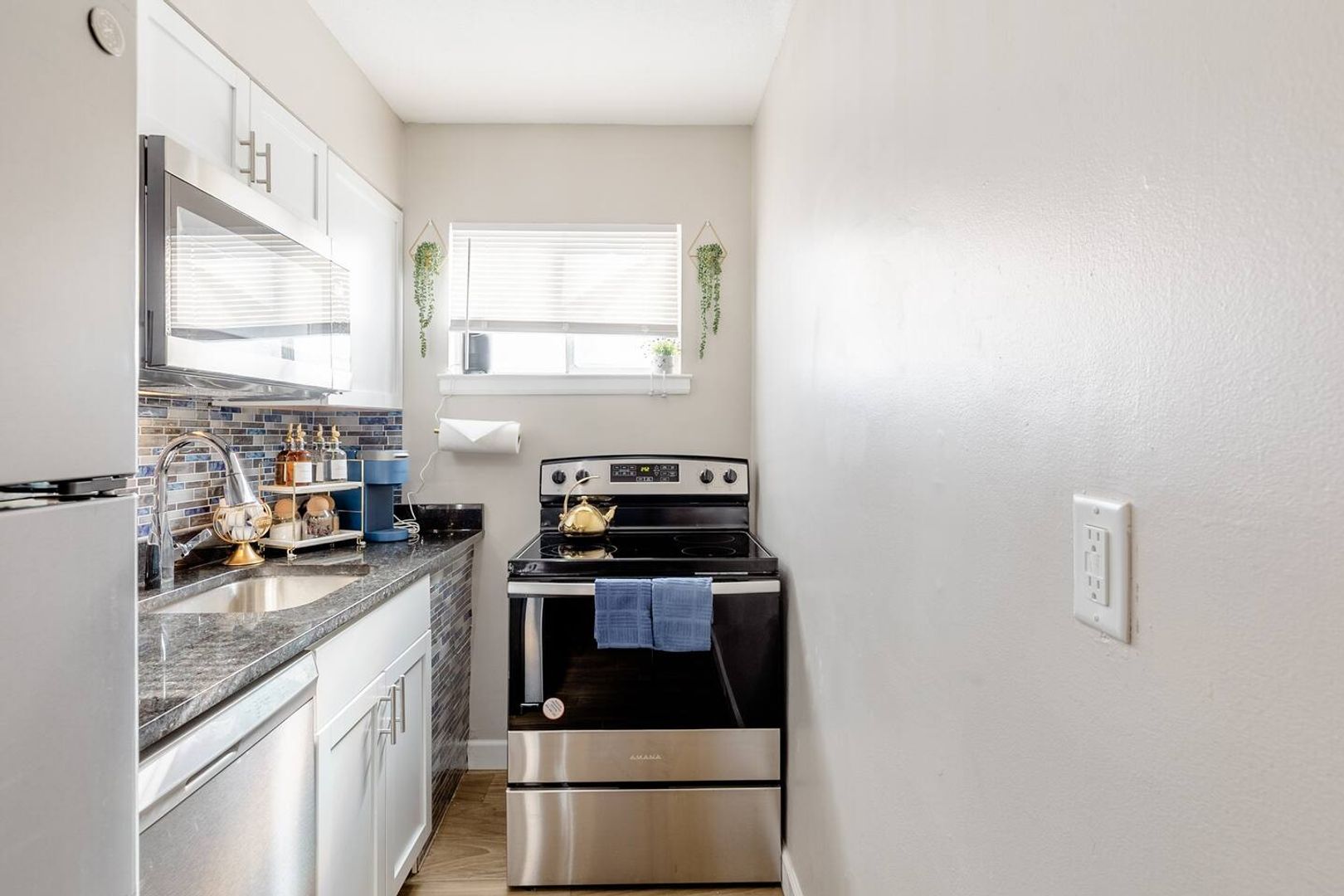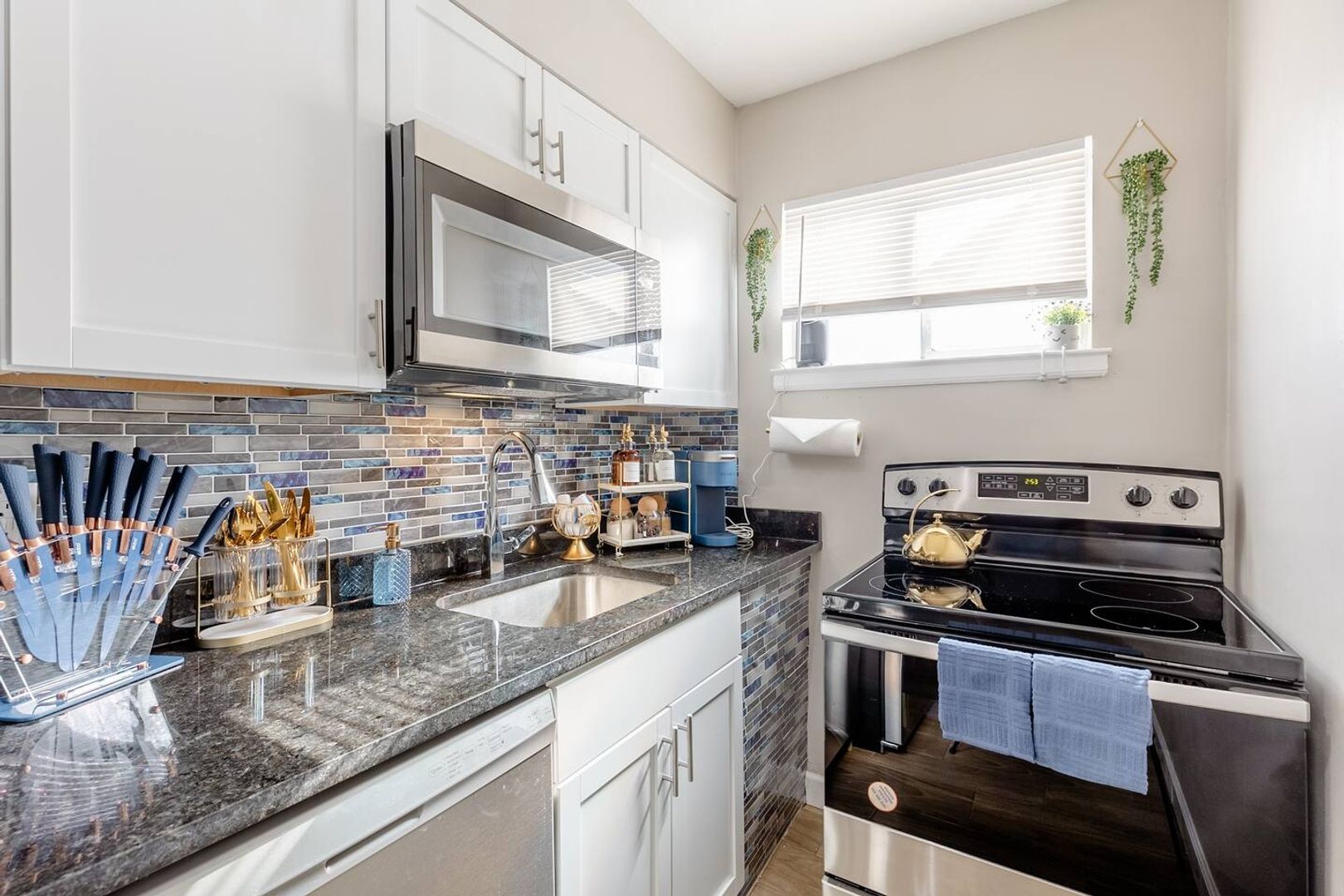 The addition of new recessed lights adds a touch of elegance to the space. The kitchen boasts brand new cabinets with stone counters, new full-size appliances for ease in completing your daily meal preparation.